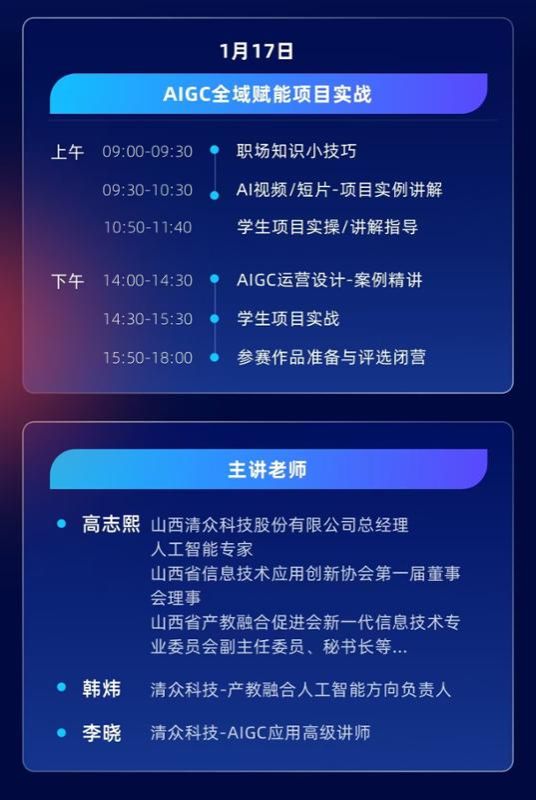 1月16日下午至17日,实训课程转入校内开展。清众科技股份有限公司派出由高志熙、韩炜、李晓等多位专家组成的讲师团队,围绕“AIGC全域赋能项目实战”这一主题,为同学们系统讲解了人工智能行业动态、AIGC工具使用、提示词工程、AI图像与视频生成、项目运营设计等内容。课程注重实操性与互动性,学生完成了从项目设计到内容生成的全流程任务,并在结营前进行了成果展示与交流点评。